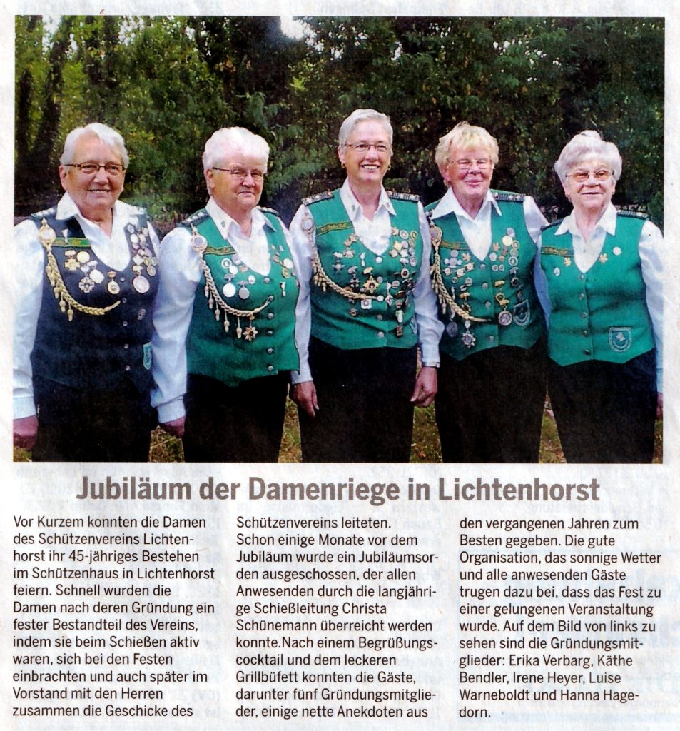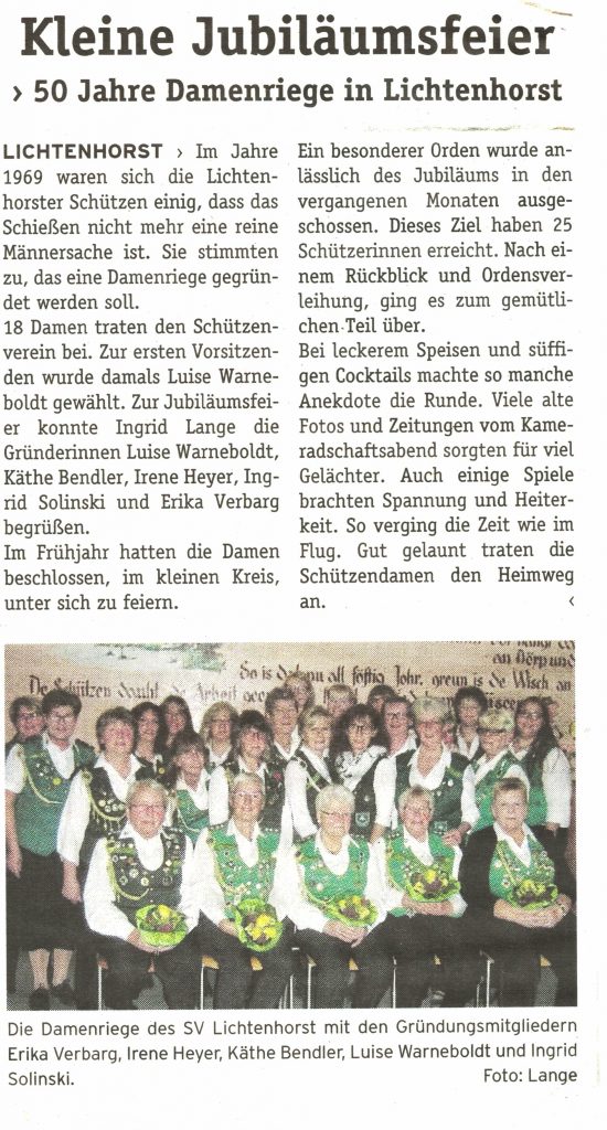 Der Schützenverein Lichtenhorst ist stolz auf seine Damenriege, die heute nicht mehr aus dem Verein weg zu denken ist. Wir hoffen, dass auch in Zukunft, gerade in unserer heutigen doch wieder schwierigen Zeit, in sportlicher und gesellschaftlicher Hinsicht Gesundheit, Glück und Erfolg ein ständiger Begleiter sind und die Damenriege auch mit unserem jungen Schützennachwuchs wachsen und gedeihen wird.
