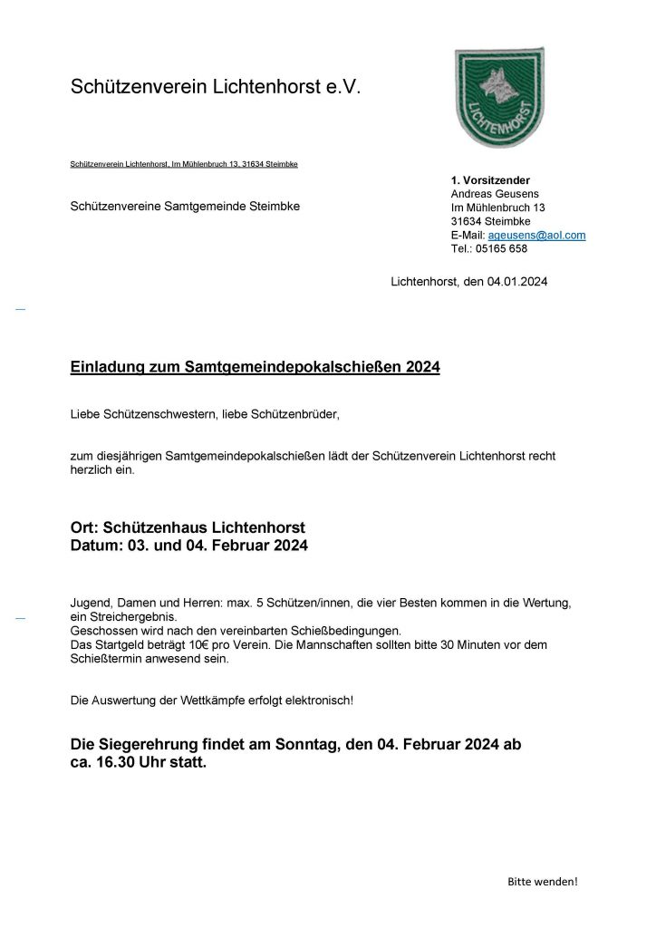 Einladung zum Samtgemeindepokalschießen am 03. und 04. Februar 2024 im Schützenhaus Lichtenhorst
