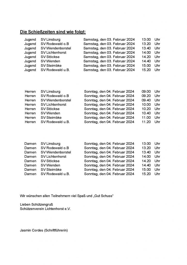 Der 1. Vorsitzende des Schützenvereins Lichtenhorst, Andreas Geusens, begrüßte am 03.02. und 04.02.2024 die Schützenvereine Lichtenhorst, Linsburg, Rodewald u.B., Rodewald o.B., Steimbke, Stöckse, Wenden und Wendenborstel zum diesjährigen Samtgemeindepokalschießen der Samtgemeinde Steimbke im Schützenhaus Lichtenhorst und wünschte allen Mannschaften ein…