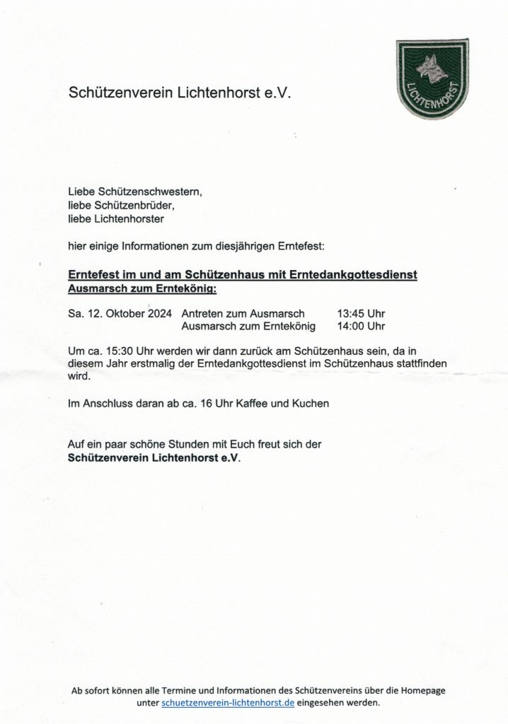 Hier erfahrt ihr alles zum Erntefestablauf 2024. Der Schützenverein Lichtenhorst e.V. freut sich auf eure Teilnahme.
