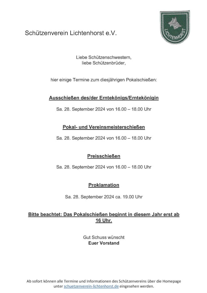 Hier erfahrt Ihr alle Termine und Schießzeiten zum Erntefest 2024. Wir freuen uns auf eine rege Beteiligung.